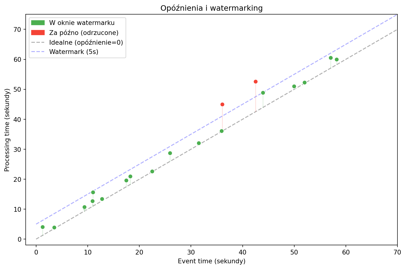 - **Watermarking** — definiujemy „znacznik wodny" — maksymalne dopuszczalne opóźnienie. Zdarzenia, które mieszczą się w oknie watermarku, są uwzględniane. Reszta odrzucana.
