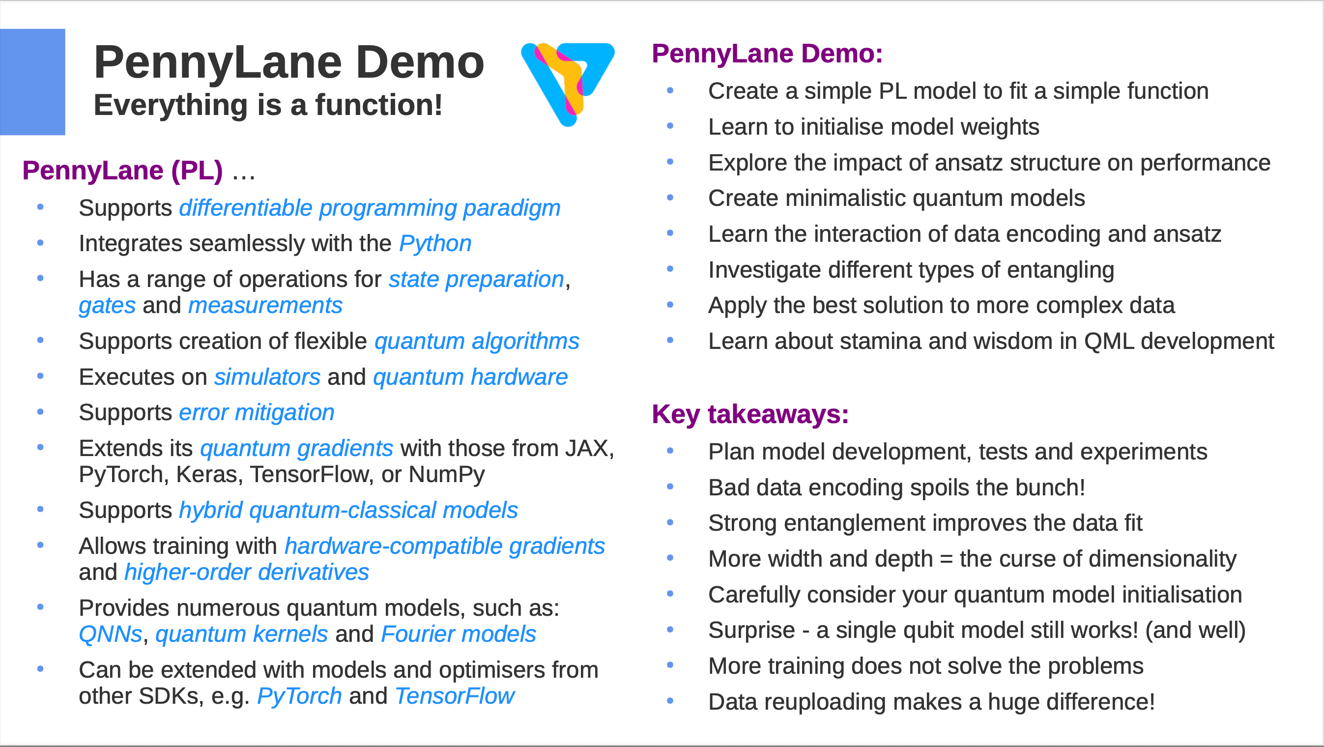 Zapewnia wysokopoziomowy, intuicyjny interfejs do budowania hybrydowych modeli kwantowo‑klasycznych, łącząc obwody kwantowe z popularnymi frameworkami uczenia maszynowego, takimi jak PyTorch i TensorFlow.