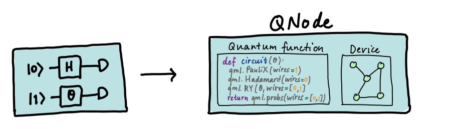 PennyLane wprowadza pojęcie QNode (quantum node) – funkcji kwantowych, które zachowują się jak zwykłe funkcje Pythona i obsługują automatyczną różniczkowanie (autodiff).