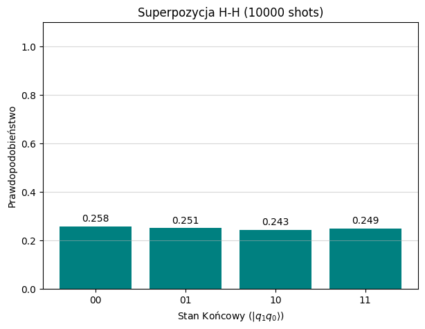 import pennylane as qmlimport matplotlib.pyplot as pltSHOTS =10000ALL_STATES = ['00', '01', '10', '11']dev = qml.device("default.qubit", wires=2, shots=SHOTS)def plot_counts_histogram(counts, title):"""Generuje histogram, wyświetlając wszystkie 4 stany (00, 01, 10, 11).""" full_counts = {state: counts.get(state, 0) for state in ALL_STATES} probabilities = [full_counts[state] / SHOTS for state in ALL_STATES] plt.figure(figsize=(7, 5)) plt.bar(ALL_STATES, probabilities, color='teal') plt.xlabel("Stan Końcowy ($|q_1 q_0 \\rangle$)") plt.ylabel("Prawdopodobieństwo") plt.title(title +f" ({SHOTS} shots)") plt.ylim(0, 1.1) plt.grid(axis='y', alpha=0.5)for i, prob inenumerate(probabilities): plt.text(i, prob +0.02, f'{prob:.3f}', ha='center', fontsize=10) plt.show()@qml.qnode(dev)def circ_bell():"""Stan Bella: splątanie, wynik powinien być ~50% '00' i ~50% '11'""" qml.H(wires=0) qml.CNOT(wires=[0, 1])return qml.counts()@qml.qnode(dev)def circ_h_h():"""Hadamard na obu: superpozycja, wynik ~25% dla każdego stanu""" qml.H(wires=0) qml.H(wires=1)return qml.counts()@qml.qnode(dev)def circ_zero():"""Stan zerowy: wynik 100% '00'"""# Brak bramek oznacza stan początkowy |00>return qml.counts()