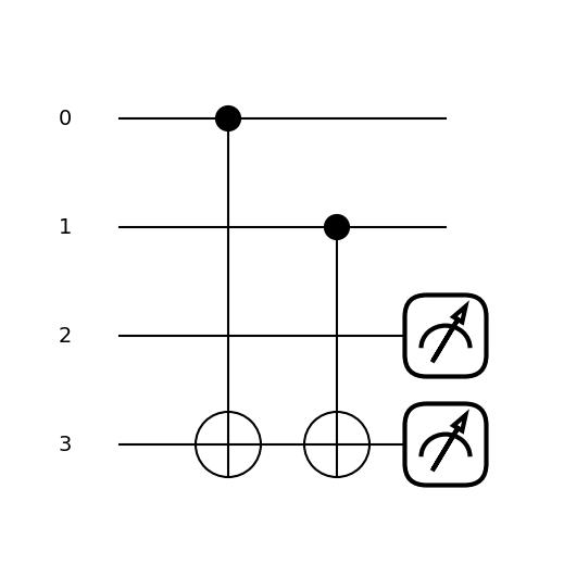 import pennylane as qmlfrom pennylane import numpy as np dev = qml.device('default.qubit', wires=4, shots=1)@qml.qnode(dev)def qc(): qml.X(wires=0) qml.X(wires=1) qml.CNOT([0,1]) qml.CNOT([0,2]) qml.Toffoli([0,1,3])return qml.counts(wires=[2,3])qc()print("wynik 1+1 =",int('10', 2))