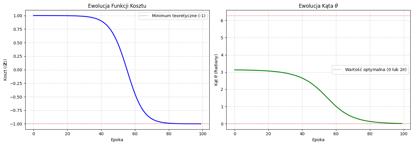 import pennylane as qmlimport pennylane.numpy as npimport matplotlib.pyplot as plt# 1. Definicja Urządzenia i Obwodu Kwantowegodev = qml.device('default.qubit', wires=1)@qml.qnode(dev)def qn(theta): qml.X(wires=0) # Ustawia stan na |1> (expval Z = -1) qml.RY(theta, wires=0) # Obrót wokół Y (zmienia expval Z)return qml.expval(qml.PauliZ(0)) # Funkcja celu: minimalizujemy expval Z# 2. Inicjalizacja Parametrów i Optymalizatora# Zaczynamy z theta, gdzie koszt nie jest minimalny, aby zobaczyć proces optymalizacji.# Np. theta = pi/2, gdzie RY(pi/2) na |1> daje 1/sqrt(2)(|1> - |0>), a expval Z = 0.theta_init = np.array([np.pi-0.01], requires_grad=True) opt = qml.GradientDescentOptimizer(stepsize=0.1)epochs =100# Listy do przechowywania historii treningucost_history = []theta_history = []# 3. Pętla Treningowatheta = theta_init # Ustawienie początkowej wartości thetaprint("--- Rozpoczęcie treningu ---")for epoch inrange(epochs):# Wykonaj krok optymalizatora i oblicz koszt theta, cost = opt.step_and_cost(qn, theta)# Zapisz historię cost_history.append(cost) theta_history.append(theta[0]) # theta jest tablicą numpy, bierzemy tylko wartośćif epoch %10==0or epoch == epochs -1:print(f"Epoka: {epoch:3d} | Kąt theta: {theta.item():.4f} | Koszt: {cost.item():.4f}")print("\n--- Trening zakończony ✅ ---")print(f"Końcowy kąt theta: {theta.item():.4f}") print(f"Końcowy koszt: {cost.item():.4f}")# 4. Wizualizacja Historii Treningufig, axes = plt.subplots(1, 2, figsize=(14, 5))# Wykres kosztuaxes[0].plot(range(epochs), cost_history, color='blue', linewidth=2)axes[0].set_title('Ewolucja Funkcji Kosztu')axes[0].set_xlabel('Epoka')# POPRAWIONA LINIA: Poprawna składnia LaTeX dla wartości oczekiwanejaxes[0].set_ylabel('Koszt ($\langle \\mathbf{Z}\\rangle$)') axes[0].grid(True, linestyle='--', alpha=0.6)axes[0].axhline(-1, color='red', linestyle=':', label='Minimum teoretyczne (-1)', alpha=0.7)axes[0].legend()# Wykres kąta thetaaxes[1].plot(range(epochs), theta_history, color='green', linewidth=2)axes[1].set_title('Ewolucja Kąta $\\theta$')axes[1].set_xlabel('Epoka')axes[1].set_ylabel('Kąt $\\theta$ (Radiany)')axes[1].grid(True, linestyle='--', alpha=0.6)axes[1].axhline(0, color='red', linestyle=':', label='Wartość optymalna (0 lub $2\\pi$)', alpha=0.7)axes[1].axhline(2* np.pi, color='red', linestyle=':', alpha=0.7)axes[1].legend()plt.tight_layout() # Teraz powinno działać poprawnieplt.show()