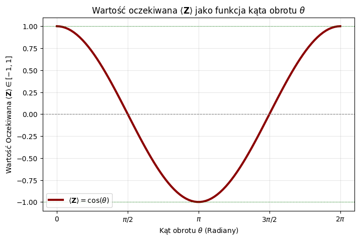 \[\mathbf{R_X}(\theta) \ket{0} = \cos\left(\frac{\theta}{2}\right) \ket{0} - i \sin\left(\frac{\theta}{2}\right) \ket{1} \] Wtedy wartość oczekiwana operatora \(\mathbf{Z}\) jest równa: \[\langle \mathbf{Z} \rangle = \cos(\theta) \] Ponieważ funkcja \(\cos(\theta)\) jest ciągła i przyjmuje wartości w zakresie \([-1, 1]\), jej wykres idealnie demonstruje to, co chcesz osiągnąć.