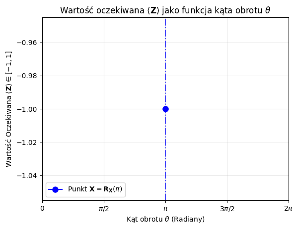 # --- Dodanie Oznaczenia dla Bramki X (theta = pi) ---pi_angle = np.pipi_expval = continuous_expval(pi_angle) # Wartość oczekiwana = -1.0# Pionowa linia w theta = piplt.axvline(pi_angle, color='blue', linestyle='-.', linewidth=1.5, alpha=0.7)# Punkt na wykresieplt.plot(pi_angle, pi_expval, marker='o', color='blue', markersize=8, label=r'Punkt $\mathbf{X} = \mathbf{R_X}(\pi)$')# Oznaczeniaplt.title(r'Wartość oczekiwana $\langle \mathbf{Z} \rangle$ jako funkcja kąta obrotu $\theta$')plt.xlabel(r'Kąt obrotu $\theta$(Radiany)')plt.ylabel(r'Wartość Oczekiwana $\langle \mathbf{Z} \rangle \in [-1, 1]$')plt.xticks([0, np.pi/2, np.pi, 3*np.pi/2, 2*np.pi], [r'$0$', r'$\pi/2$', r'$\pi$', r'$3\pi/2$', r'$2\pi$'])plt.grid(True, linestyle='-', alpha=0.3)plt.legend(loc='lower left')plt.show()
