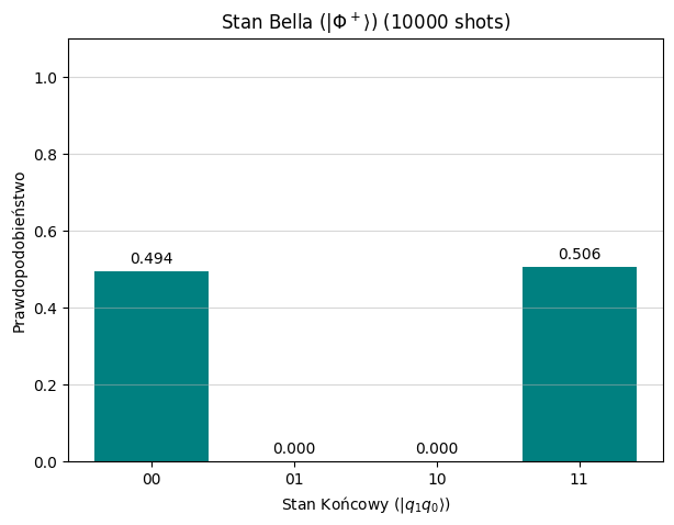 # Wywołanie dla Stanu Bellaprint("Symulacja Stanu Bella...")counts_bell = circ_bell() plot_counts_histogram(counts_bell, "Stan Bella ($|\\Phi^+ \\rangle$)")