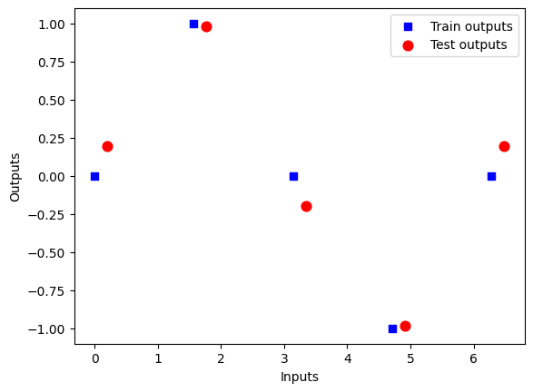 ax1.scatter(X, Y, s=30, c='b', marker="s", label='Train outputs')