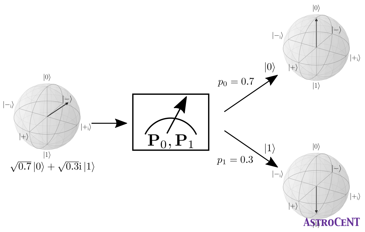 Pomiar niszczy superpozycję kubitu i sprowadza go do jednego ze stanów bazowych.