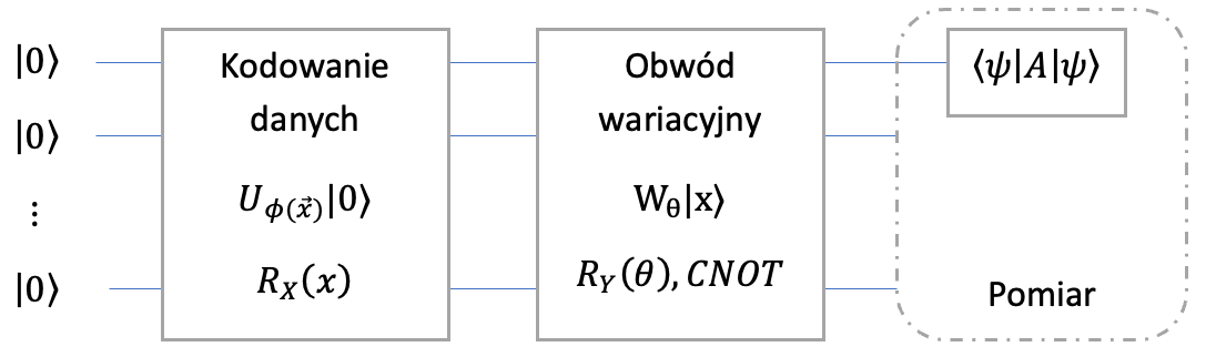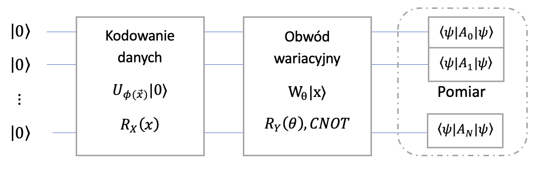 Parametryzowany kwantowy obwód wariacyjny reprezentowany przez operator \(W_\theta\) zależny od wektora parametrów \(\theta\), który działa na wektor stanu przygotowany przez obwód kodujący dane \(W_\theta \ket{\phi}\), gdzie \(\ket{\phi}\) przygotowaliśmy za pomocą kodowania danych. Ze względu na bardzo dużą ilość kombinacji bramek, które można łączyć równolegle i szeregowo trudno jest wskazać jeden konkretny obwód pozwalający realizować wszystkie problemy analityczne (nie ma darmowych obiadów). Wybór odbywa się najczęściej poprzez ustalenie różnych schematów i ich trenowania. Porównać można to do klasycznych sieci neuronowych, gdzie ilość warstw ukrytych, liczba neuronów w każdej warstwie czy funkcje aktywacji są tzw. hiper-parametrami, które ustala się przez doświadczenie. Wybrany schemat obwodów kwantowych określa się często mianem ansatzu.