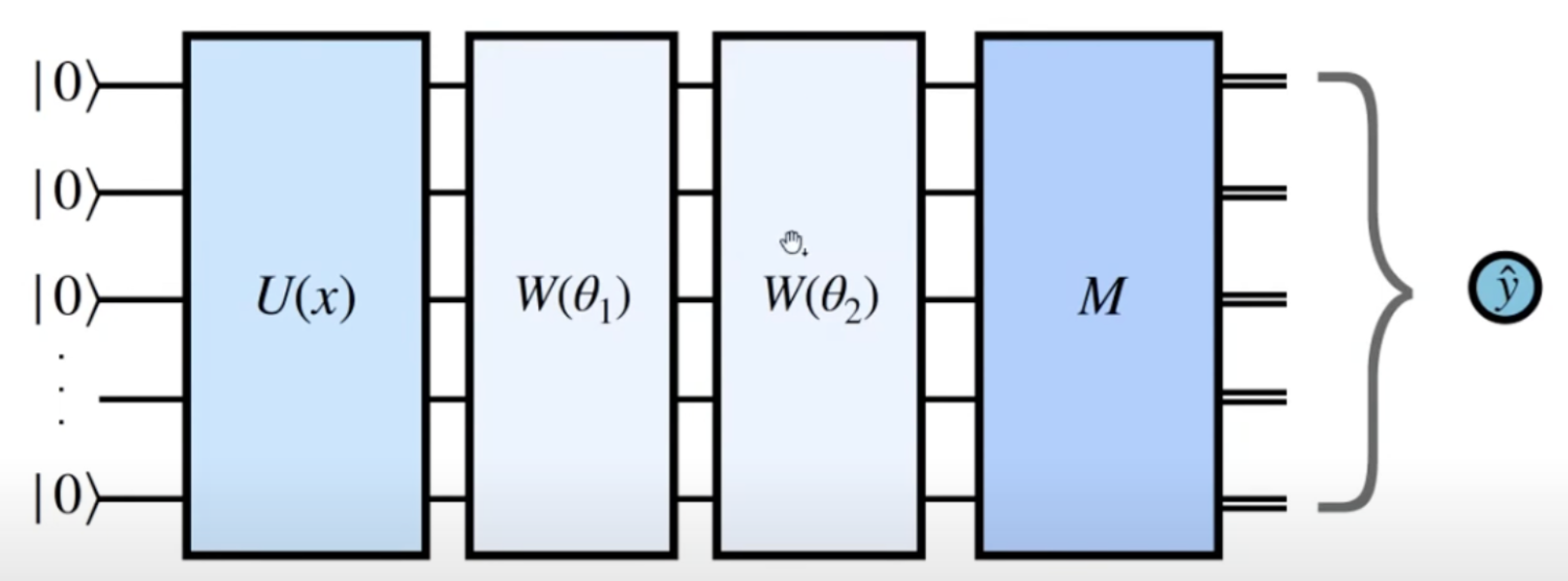 Wiemy juz jak składać bramki w celu utworzenia dowolnego (i o dowolnej głębokości) obwodu. \[ \ket{\psi'} = U_m(\theta_m)\dots U_2(\theta_2) U_1(\theta_1) \ket{\psi} \]