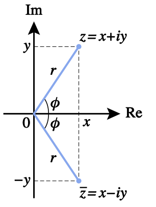 \[ z=x + i\, y\,\,\,\,\] to \[\,\,\,z^*=x - i y = r e^{-i \phi} .\]